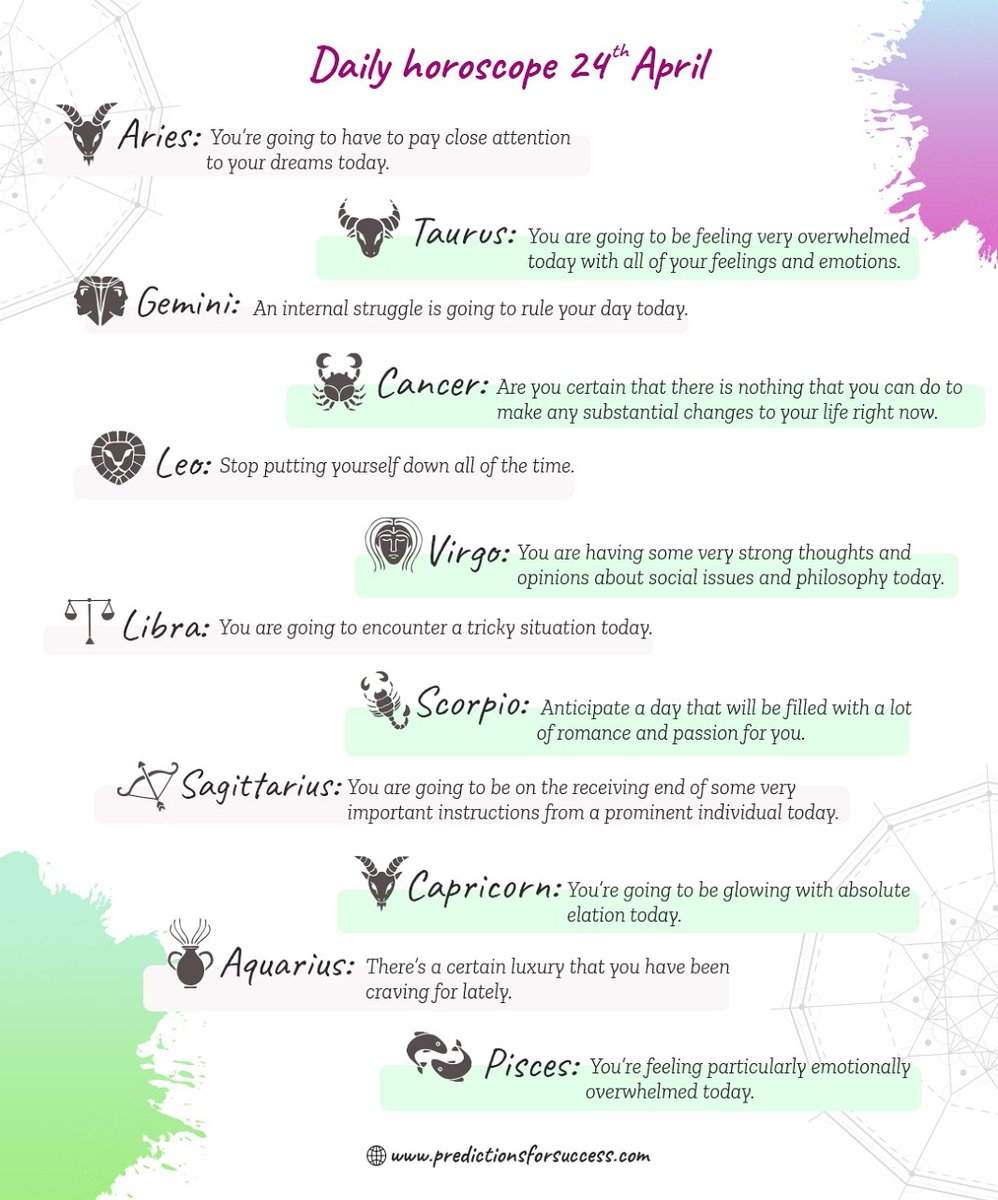 Daily One Card Tarot Reading For All Zodiac Signs April 24 2021 Yourtango from www.yourtango.com Your ruling planet is venus that symbolizes love, money, pleasures, likes, dislikes and the compromises we are ready to make. And the same research showed that both sexes, males and females are equally interested in knowing all about their date of birth, what does it mean, and is it something that we can affect. Your moon & rising signs. Virgo and capricorn as they tend to share the same vision of life. Get to know your daily astrology prediction and horoscope for leo, virgo, libra, scorpio, pisces, gemini, sagittarius, and other zodiac signs. Want to know what's in the store for you, and find out what your sun sign says about the day that will be? The april 24 birthdate horoscope profile shows that you are emotionally stable and mature. See what's in store for you.